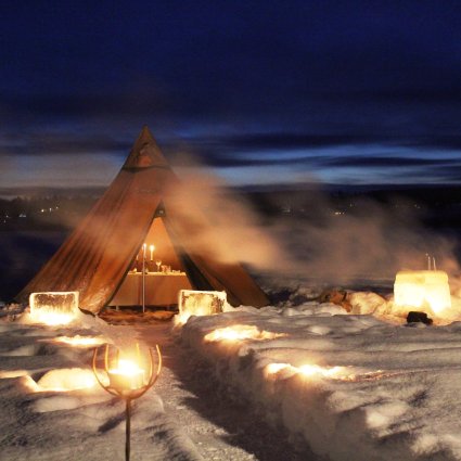 Der Abend wird von Fackeln und Kerzen erleuchtet, während Sie gemütlich auf Rentierfellen sitzen. Ihnen wird ein lokales 3-Gänge Menü in einem beheizten Tipi auf einem zugefrorenen See serviert. Genießen Sie das Essen in dieser spektakulären Umgebung!