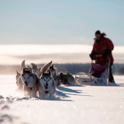 Fahren Sie durch die magische Winterlandschaft mit schneebedeckten Wäldern und zugefrorenen Seen. Während Sie sich zurücklehnen und die Natur bewundern, erleben Sie dieses immense Verlangen der Hunde zu rennen und den Schlitten zu ziehen.