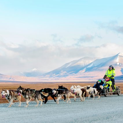 Erleben Sie eine aufregende Tour in einem von Huskies gezogenen Wagen durch das Adventtal. Diese Tour wird während des Sommers angeboten, wenn der Schnee beginnt zu schmelzen.