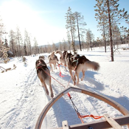 Ein Reiseleiter wird Sie in Kakslauttanen abholen und Sie auf der Husky-Farm mit Thermo-Kleidung ausstatten. Im Anschluss ist es Zeit die Hunde zu treffen, die schon ganz aufgeregt vor den Schlitten warten. Der Reiseleiter wird Ihnen erklären, wie man den Schlitten stoppt, lenkt und fährt. Dann fahren Sie in den winterlichen Wald. Während einer Pause können Sie sich mit einem warmen Mittagessen am offenen Feuer aufwärmen, während Sie den Geschichten über Huskies lauschen.