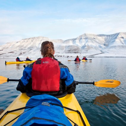 Nehmen Sie an einer geführten Kajaktour teil und wandern Sie mit einem erfahrenen Führer vom farbenfrohen Longyearbyen über den historischen Adventfjord zur Geisterstadt Hiorthamn auf den Berg Hiorfjellet.