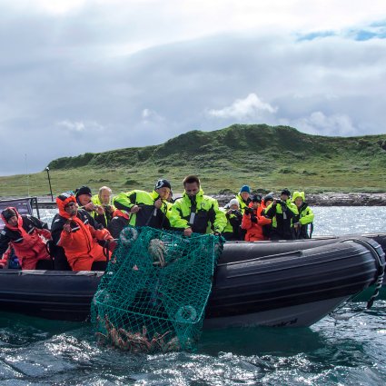 Das Schnellboot bringt Sie nach Sarnesfjorden, wo gestoppt wird um nachzusehen, was sich in den Fallen unten in der Tiefe befindet. Die Königskrabbe kann eine Spannweite von bis zu zwei Metern zwischen ihren Zangen aufweisen und bis zu 10 Kilo wiegen. Jedoch werden Sie eher die „kleinen“ Krabben von 3 bis 7 Kilo fangen.