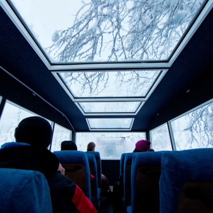 Sie werden in einer warmen Panorama-Kabine sitzen, durch die Sie verschneite Felder, majestätische Kiefern, Wälder und vielleicht sogar die wunderschönen Nordlichter erblicken können. Während des Ausfluges haben Sie die Möglichkeit Fotos zu machen, und es wird einen Stopp geben, um die arktische Natur zu erleben. Während der Safari bekommen Sie ein Heißgetränk und eine süßes Gebäck.