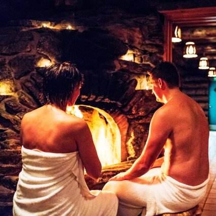 Sauna, Eispool-Erlebnis (nur im östlichen Dorf), Handtücher und Wollsocken. Die kleine Rauchsauna ist für bis zu 8 Personen geeignet.