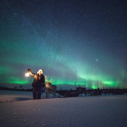 Sie werden zum nahegelegenen Torassieppi-Hof gebracht, wo ein lokaler Rentierhirte Sie mit auf eine aufregende Rentiersafari durch den nächtlichen Wald nimmt. Mit ein bisschen Glück haben Sie die Chance, die Nordlichter (Aurora Borealis) über den Himmel tanzen zu sehen. Nach der Schlittenfahrt wird Ihnen ein heißes Getränk serviert.
