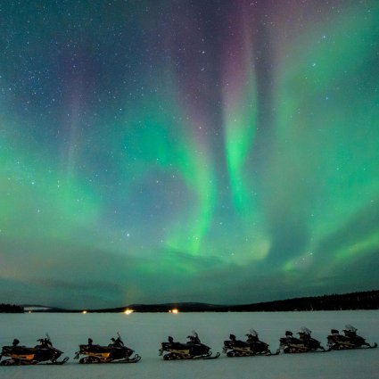 Nehmen Sie an dieser Schneemobilsafari teil und begeben Sie sich auf die Suche nach den magischen Nordlichtern. Abendessen in einer Hütte in der Wildnis inklusive.