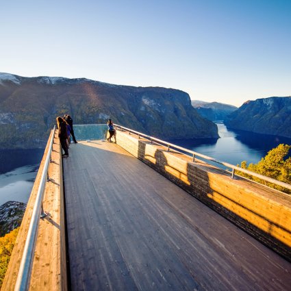 Erleben Sie den spektakulären Aussichtspunkt Stegastein mit einem Panoramablick 650 Meter über den Aurlandsfjord. Dies ist eine schöne kurze Sightseeing-Tour, die Sie bei einem Besuch in Flåm machen sollten.