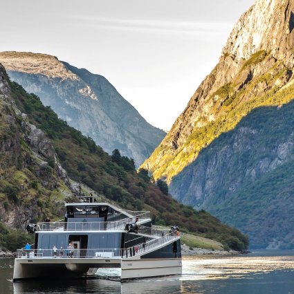 Die Reise beginnt mit dem Zug von Bergen nach Voss. Dort fahren Sie anschließend mit dem Bus nach Gudvangen. Eine zweistündige Fjordfahrt bringt Sie durch den Nærøyfjord, Europas schmalsten Fjordkanal und Teil des UNESCO-Weltkulturerbes, nach Flåm. Sie fahren mit einem neuen umweltfreundlichen, vollelektrischen Schiff, das in Design und Technologie einen völlig neuen Standard darstellt. Das Schiff fährt mit Batterieantrieb und hält eine Geschwindigkeit von weniger als 10 Knoten ein, damit Sie die Landschaft in vollen Zügen genießen können. Das Design des Schiffes ist von einem Pfad inspiriert, der sich einen steilen Berghang hinaufzieht. Es ist 40 Meter lang und 15 Meter breit. Am Außendeck der Fähre können Sie das ganze Boot erkunden, vom Inneren haben Sie einen unvergleichbaren Panoramablick. Das nordisch inspirierte Innendesign bietet ein hohes Maß an Komfort.