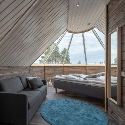 Wenn Sie in einem Wildniszimmer im Wilderness Hotel Inari übernachten, haben Sie die Möglichkeit, Ihre erste oder letzte Nacht zu einer Aurora Kabine zu upgraden.