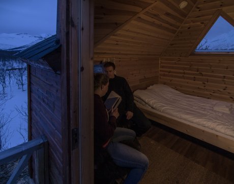 Übernachten Sie im Camp Tamok außerhalb von Tromsø. Das Aurora Chalet (Nordlichter-Hütte) ist die privateste Unterkunft, für zwei Gäste Platz bietend. Die Kabinen sind eher klein gehalten und verfügen über keinen Strom oder fließendes Wasser, werden jedoch beheizt.