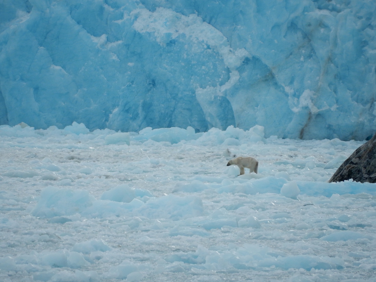 Ja! Wir haben sogar drei gesehen! Der erste, den wir entdeckt haben, befand sich nahe des Smeerenburg-Gletschers, gleich am zweiten Tag der Seereise. Am letzten Tag erspähten wir vom Flughafen aus einen Mutterbären mit ihrem Jungen (sie befanden sich am anderen Ende des Fjordes).